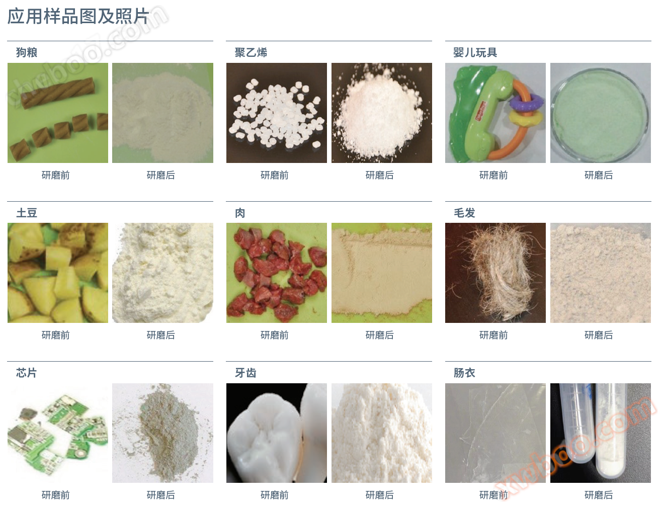 Vissa prover är fysiskt flexibla och hårda vid normala temperaturer, svårt att krossa och slipa, och de fysiska egenskaperna förändras vid flytande kvävetemperatur, vilket gör det lätt att slipa och krossa, såsom hår, fjäder, gummi, ben och så vidare. Vid malning kommer termisk effekt att produceras, vid normaltemperatur malning kommer att göra provtemperaturen dramatiskt öka, flytande kväve frysning malning prov på grund av att alltid blötskas i flytande kväve för att undvika friktion uppvärmning och förlora flyktiga ämnen och känsliga provämnen, behålla flyktiga ämnen i stängd malning tank, så att vissa ämnen producerar deformation, diffusion, såsom kolväten, lågkokande metaller och så vidare. Ultra låg temperatur kan eliminera provnedbrytning och undvika att förstöra protein, DNA och RNA-prover.